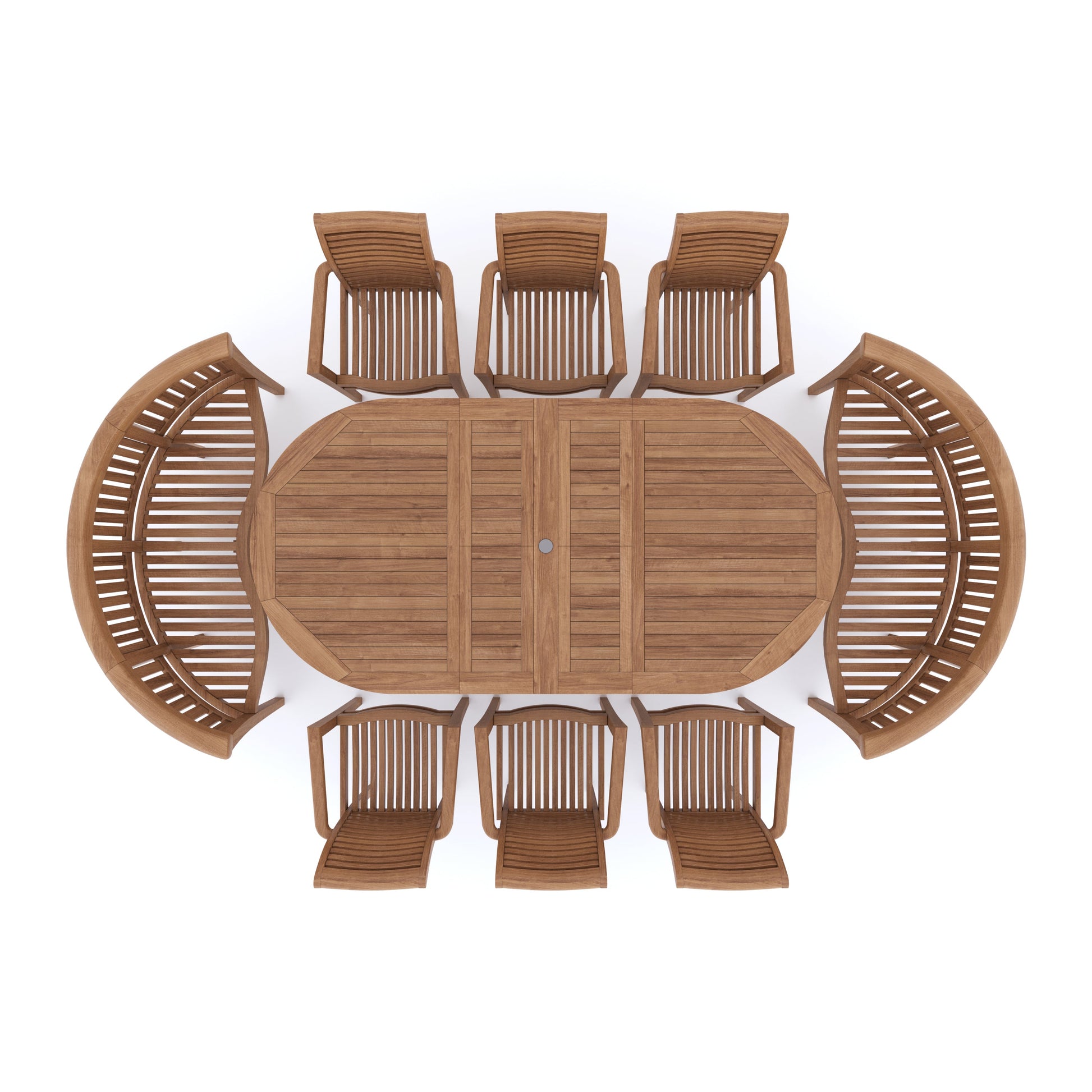 Teak 180-240cm Oval Extending Table 4cm Top (6 Oxford Stacking Chairs 2 San Francisco Benches) Cushions included.
